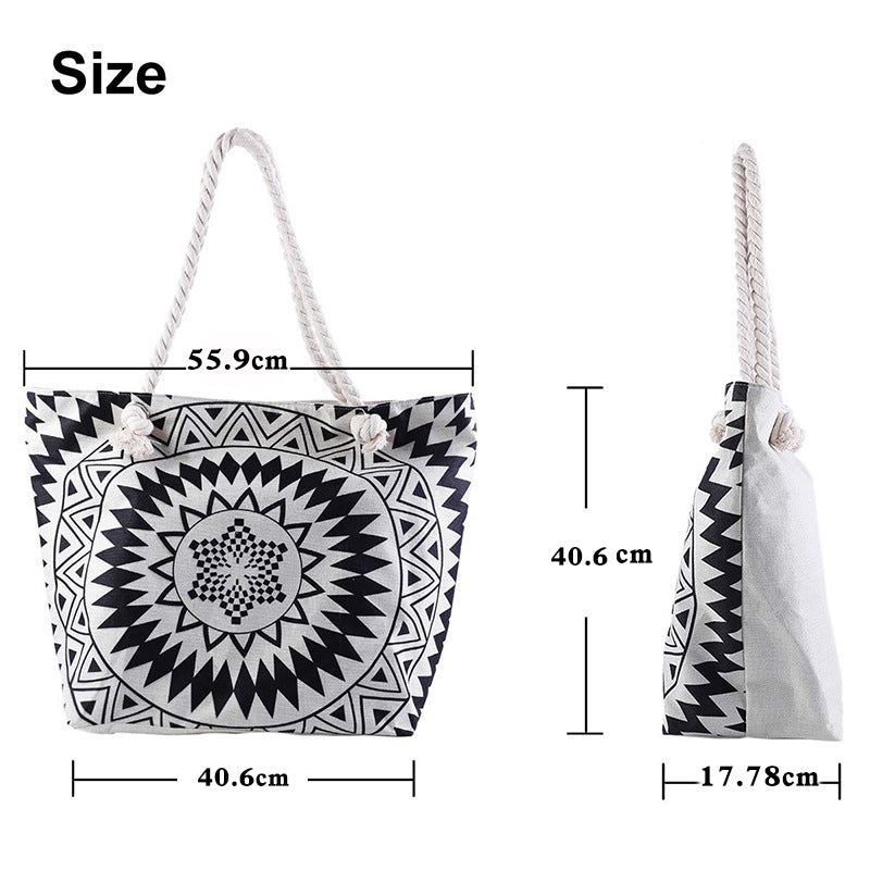 Ontworpen met hoogwaardig canvas, katoen en polyester, is deze strandtas duurzaam en gaat lang mee. Het formaat van 55x40x17 cm is perfect om alles in te doen wat je nodig hebt voor een dagje aan het strand, en met de touwband kun je hem gemakkelijk over je schouder dragen. Met zijn ontwerp in bohemian stijl voegt deze strandtas een vleugje elegantie toe aan uw strandkleding.